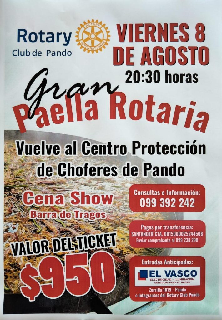 El valor del ticket es de $950, y las entradas anticipadas ya están disponibles en El Vasco (Zorrilla 1019, Pando) o con los integrantes del Rotary Club.